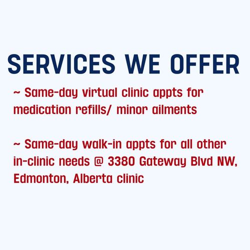 DR REFILL is a convenient way to get your medications refilled same-day virtually or in-person for all of your in-clinic needs at our brand new Edmonton clinic location at 3380 Gateway Blvd NW at South Trail Plaza.